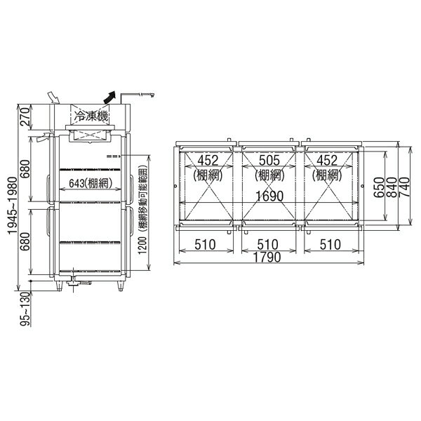 商品の仕様●外形寸法:W1790mm×D840mm×H1950mm●製品質量:255kg●消費電力(50/60Hz):冷却時795/855W・霜取時672W●受注生産品となりますので、お届けまでにお時間がかかります。